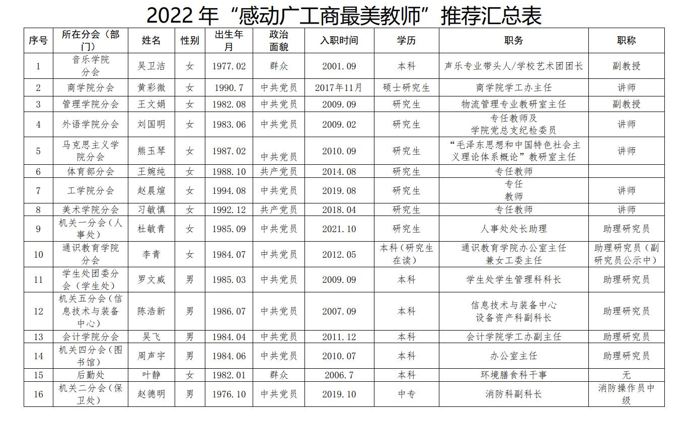 党的二十大即将召开。在这样一个重要的时间节点,学校工会开展“喜迎二十大,建功新时代”——“2022感动广工商最美教工”展示活动,由各分工会按要求推选一名优秀教工事迹进行展示,充分展现ky开元不同岗位上的教工辛勤耕耘、默默奉献、立德树人的风采。各分工会推选名单如下:
