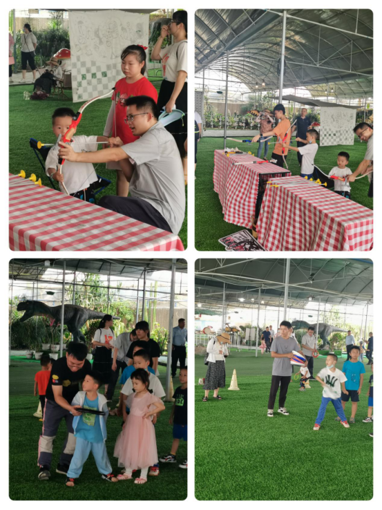 接着大家一起前往晨采庄园罗仙基地果园开展亲子活动。庄园工作人员组织小朋友们一起玩游戏,家长们也和小朋友一起玩各种游乐项目,画面温馨和谐,欢乐无限。