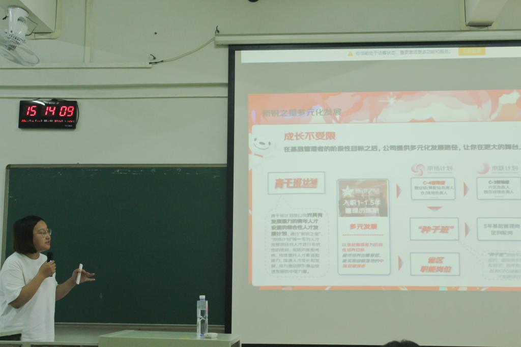 宣讲会的最后,京东代表向同学们介绍了校招对象,为同学们提供了就业岗位和方向。同时,京东代表指出“新锐之星”项目为学生们提供了职业发展路径和晋升机会,助力其在物流领域实现个人价值和社会价值的双重飞跃。