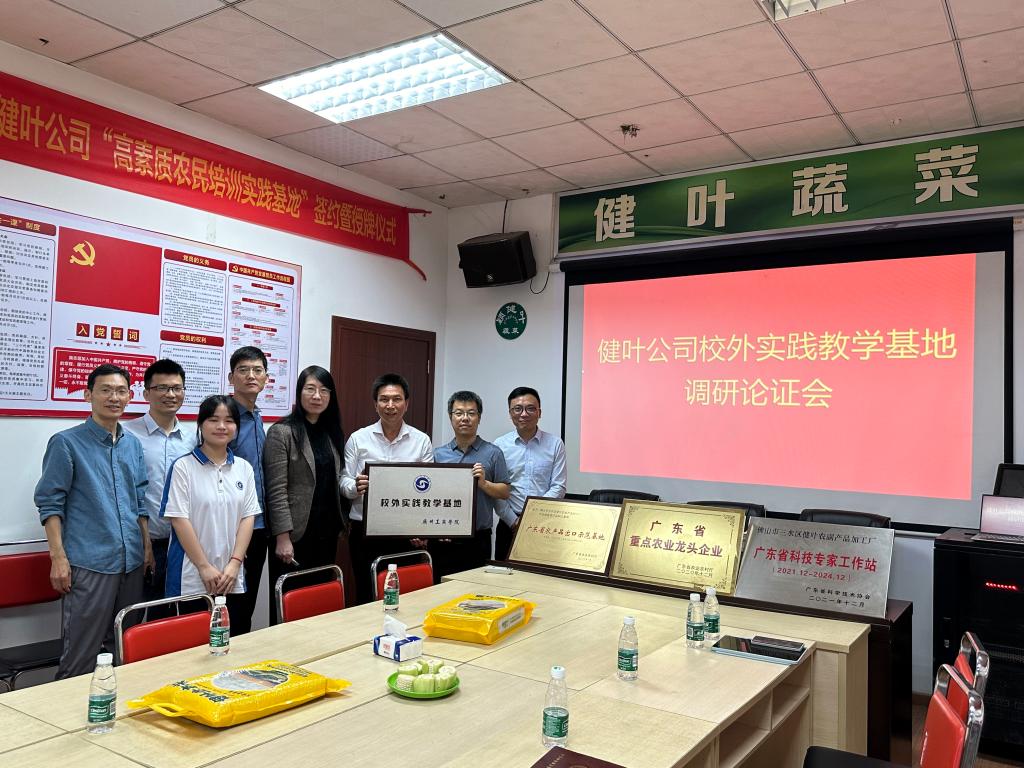 【本网讯】为进一步深入校企产教融合,更好地促进学生实习就业,3月26日,管理学院与佛山健叶农副产品加工厂在佛山三水区芦苞镇健叶农副产品加工厂会议室举行了共建校外实践教学基地调研论证会。管理学院院长乔鹏亮、副院长邹剑峰、副院长赵小锋、院办公室主任陈海松、工商管理教研室主任单丽薇副教授、校外实践教学基地项目负责人陈伟副教授、学生代表黄佩文、健叶农副产品加工厂董事长叶桂柱、总经理王荣等参加了会议,并见证了双方就达成共建校外实践教学基地进行了授牌仪式。