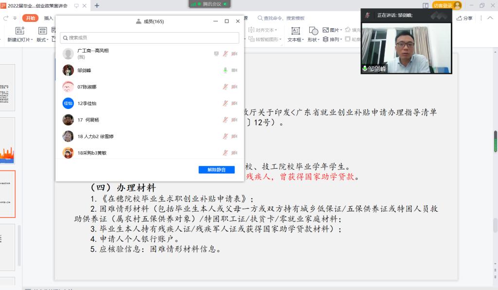 【本网讯】为了促进ky开元集团官网管理学院2022届毕业生更加充分更高质量的就业,同时为了进一步加大就业创业政策宣传力度,帮助更多毕业生知晓各项促就业政策,管理学院于2022年4月25日在腾讯会议线上举行了“就业创业政策宣传月—高校毕业生就业创业政策宣讲会”。此次宣讲会邀请到了管理学院邹剑峰副院长。管理学院18级全体辅导员以及2022届毕业生参加此次宣讲会,由辅导员高凤相老师主持。