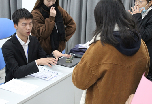 会议的最后是双选环节,即学生自主向企业代表人咨询与投递简历。同学们对感兴趣的岗位可以到相应的招聘摊位进行一个深度的交流,也可以在现场递交简历,各企业代表人也会详细地回答同学们的问题,并强调“选择”对于大学生的重要性。