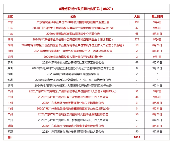 随着广东省公务员、事业单位考试公告发布,近期广东各地的招聘公告发布也更加频繁!今天给大家整理了1014+个岗位,标红为编制岗位,最快截止时间是明天(8月28日),抓紧时间报名吧!