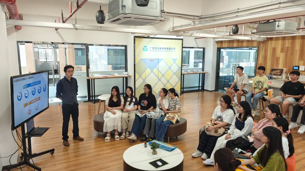 通过企业参观,感受科技与创新的力量。广东汉生新材料有限公司是广东省高校成果转化中心重点引进项目,专注于生物质降解新材料的研发与生产。在企业的精心安排下,学生们首先参观了公司的研发中心和办公区域,实地探究了企业在生物质材料领域的核心技术应用情况。企业拥有先进的“两所·三平台”架构和丰富的科研成果,拥有191项知识产权、54篇学术论文,令学生们印象深刻;尤其是生物医用材料、绿色农业循环技术等领域的创新成果,展现了科技与环保的完美结合。通过深入了解基地“研发-孵化-产品化-产业化”的全链条服务体系,对高校技术产业化新路径有了更深刻的认识。