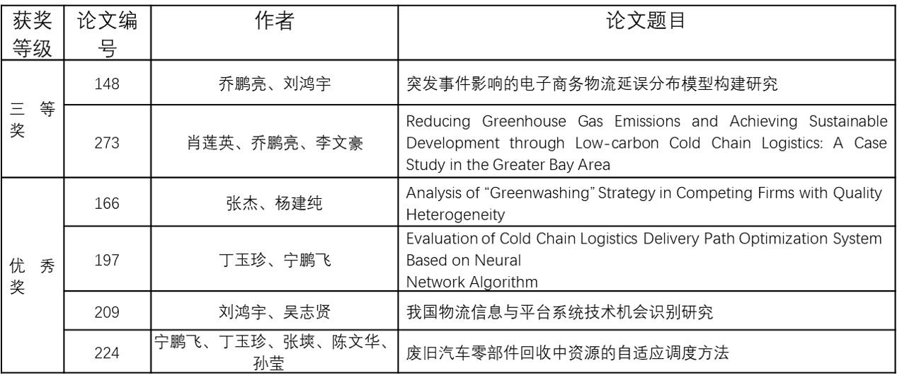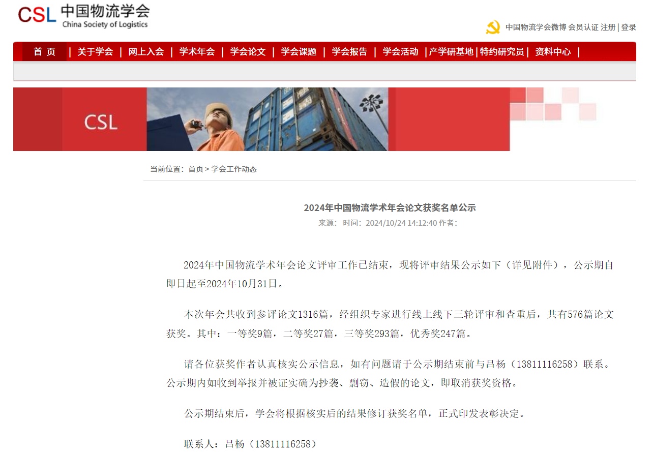 【本网讯】近日,由国家一级学会中国物流学会主办的年度优秀论文评审工作已经结束,其2024年度优秀论文奖的获奖名单在其网站上已公示。