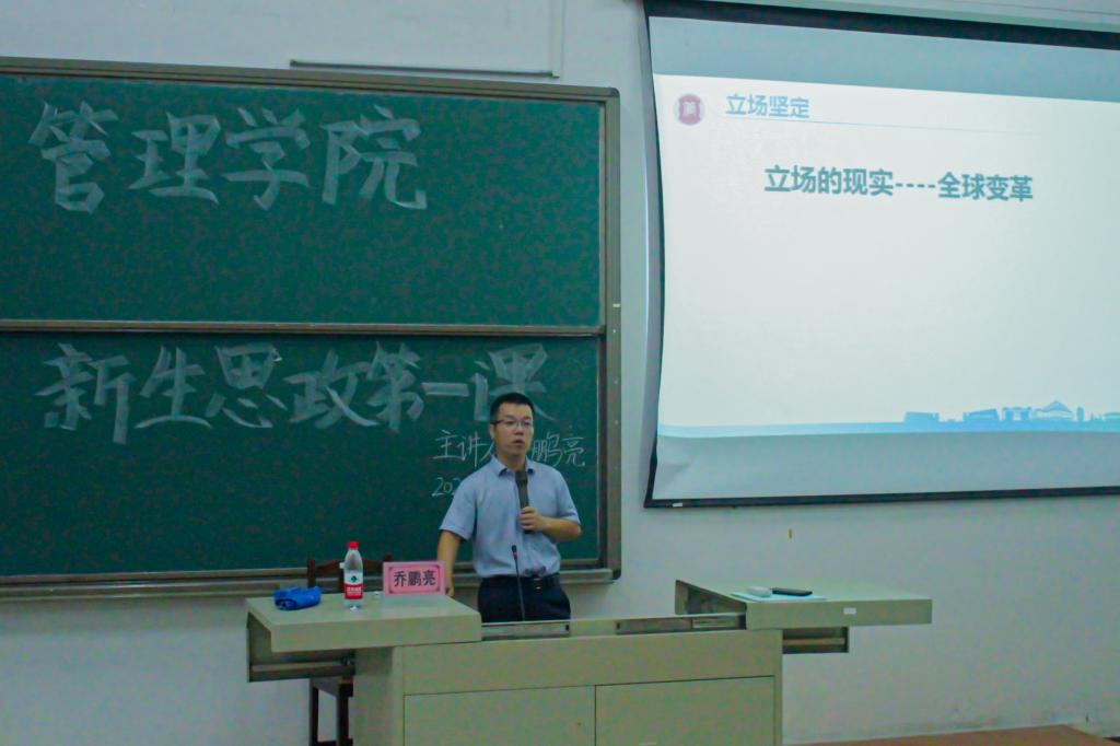 【本网讯】为加强管理学院24级新生坚定立场、明确方向、提升素养以及对如何实现中华民族伟大复兴的认识,管理学院于2024年10月15日晚在第二实验楼C305开展2024级新生“思政第一课”。管理学院党委书记、院长以“坚定立场、励志修能,实现中华民族伟大复兴的中国梦”为题讲授思政第一课。