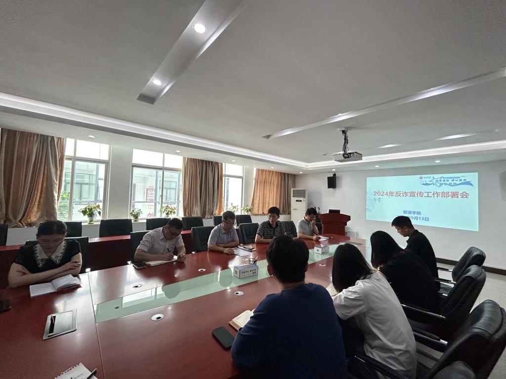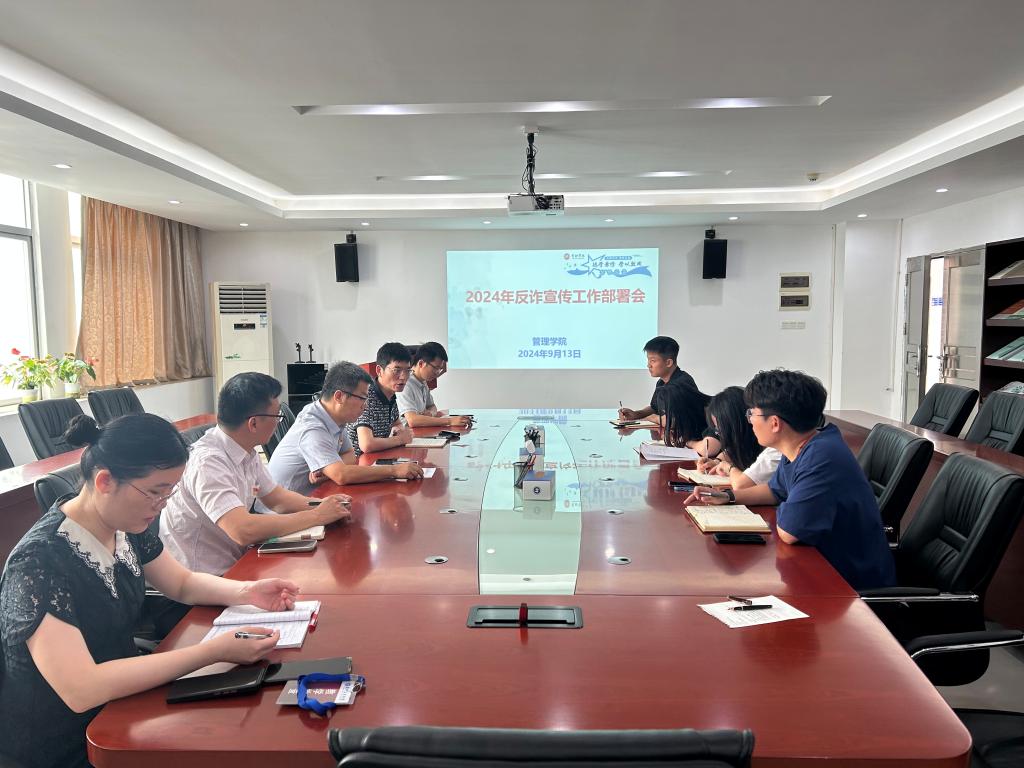 【本网讯】为增强学生的防范诈骗意识,维护校园的和谐稳定,积极落实学校2024年反诈宣传活动月工作方案的要求,管理学院于2024年9月13日,在院部楼612组织召开以“你我同心,反诈同行;共筑长城,守护校园”为主题的反诈宣传工作部署会议。出席本次会议的嘉宾有管理学院院长乔鹏亮、副院长赵小锋,管理学院党委全体委员。本次部署会议由赵小锋副院长主持召开。