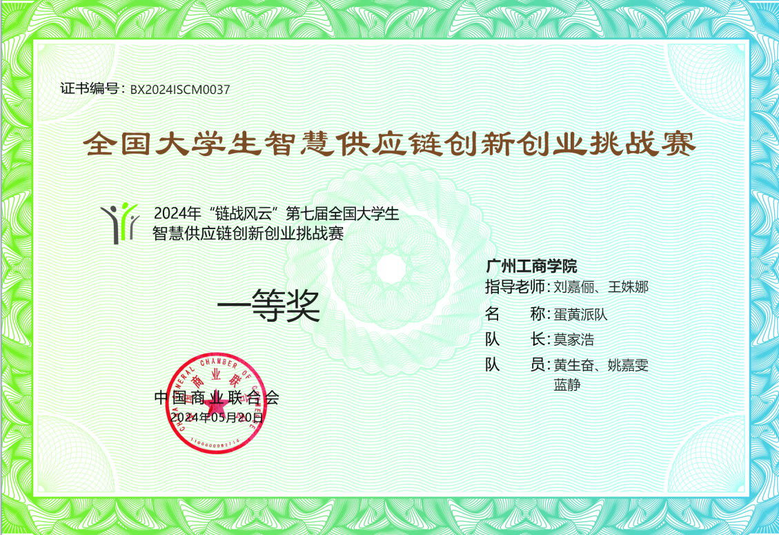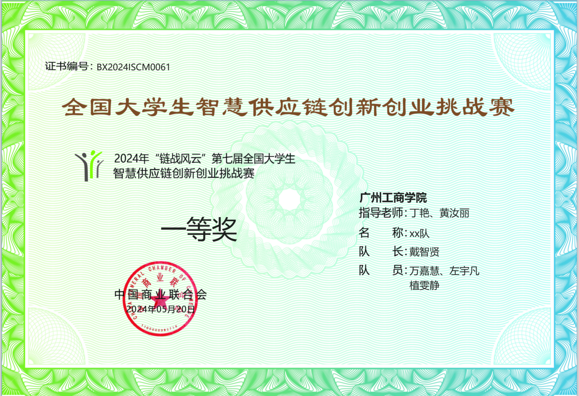 【本网讯】2024年5月18-19日由中国商业联合会主办的2024年“链战风云”第七届全国大学生智慧供应链创新创业挑战赛初赛在线举行。我院物流管理专业学生以莫家浩、戴智贤、李燕丽为队长的三支队伍获得2个一等奖、1个二等奖的好成绩。