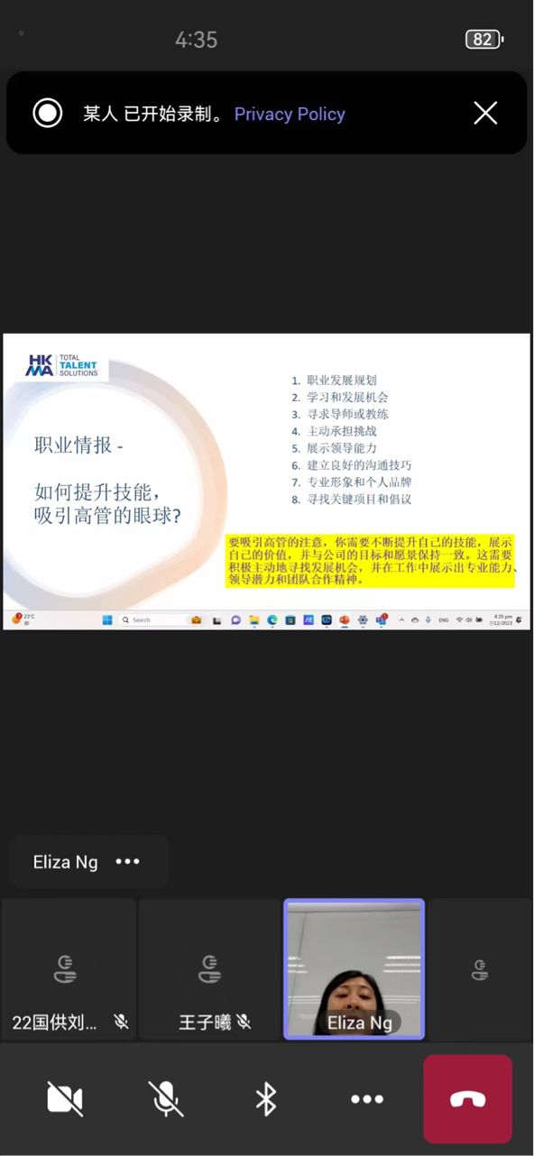 【本网讯】为进一步提升ky开元学子的工作技能,在工作中能获得快速发展,得到高管的欣赏与青睐,学校特邀香港管理专业协会首席顾问伍雪芬女士于2023年12月7日召开了以“职业情报——如何提升技能,吸引高管的眼球?”为主题的线上讲座,22级、23级工商管理及物流供应链运营等班学生参与此次会议。