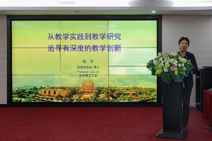 会议进入到主旨报告阶段。首先由广东省高等教育学会教育技术专业委员会的副秘书长、广东省本科高校在线开放课程教职委委员、华南理工大学陆芳教授进行了题目为“从教学实践到教学研究:追寻有深度的教学创新”的教学指导。在指导中,陆教授先提出了,在课程建设中,以坚持质量为本,把好政治学术质量关的前提下,产教融合工作的建设是重中之重的观点。随后,陆教授就在应用型大学当中,如何从教学的实践走向教学研究走向有深度的教学创新进行了讲述。
