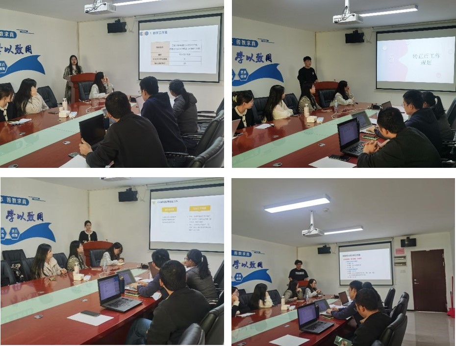 (1)新教师述职汇报:9位新教师逐一进行了关于“聘期中期考核”的PPT展示与汇报,大家准备充分,时间安排得当,汇报有序进行。