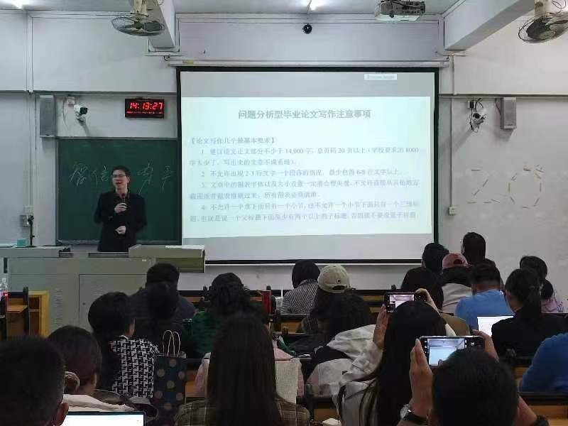 随后,侯治平教授针对毕业论文写作提出了一系列注意事项。他强调了问题分析型毕业论文写作的关键要点,包括字数要求、段落规范要求、图表要求以及论文框架等方面的具体要求,为在座的教师们提供了宝贵的指导意见。