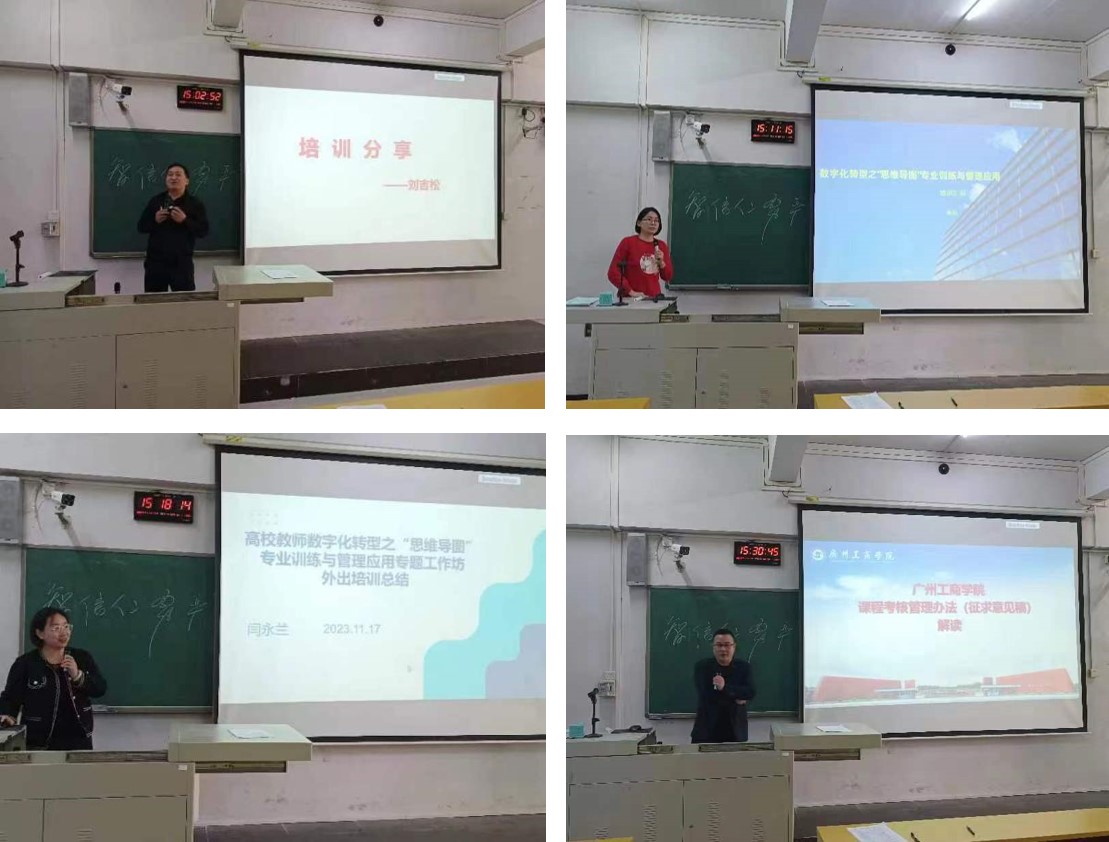 在会上,胡能老师分享了基于OBE理念以学生为中心的课程教学大纲,强调了以产出为导向的设计思维,并结合课程目标设计考核形式与考核内容,提出了学习目标方收尾的BOPPPS教学方法。刘吉松老师则分享了如何进行有效的教学以及解决“教”与“学”的矛盾,强调了BOPPPS教学方法的重要性,并通过文艺复兴中的达文西的案例进行了具体阐述。柳颖老师则分享了数字化转型中的“思维导图”专业训练与管理应用,介绍了培训导师的介绍以及培训内容,强调了对思维进行结构化处理的重要性。最后,闫永兰老师介绍了思维导图高校应用课程,并详细阐述了思维导图的技法、心法、应用以及误区。