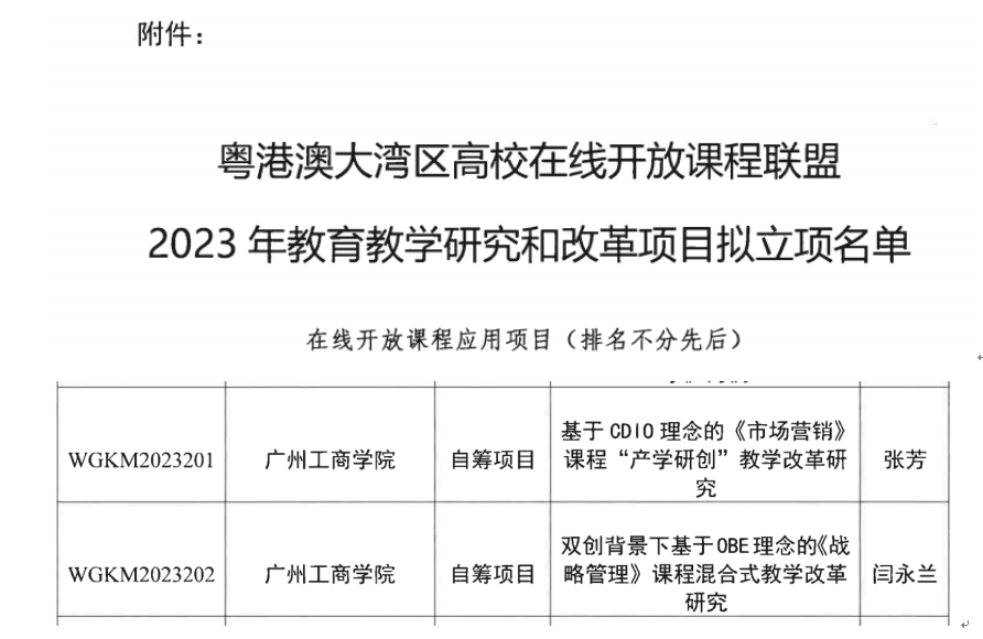 【本讯网】粤港澳大湾区高校在线开放课程联盟公布了2023年教育教学研究和改革项目立项名单【湾高课盟通(2023)5号】。我院申报项目“基于CD10理念的《市场营销》课程“产学研创”教学改革研究”、“双创背景下基于OBE理念的《战略管理》课程混合式教学改革硏究”成功立项。恭喜我院张芳、闫永兰两位老师。