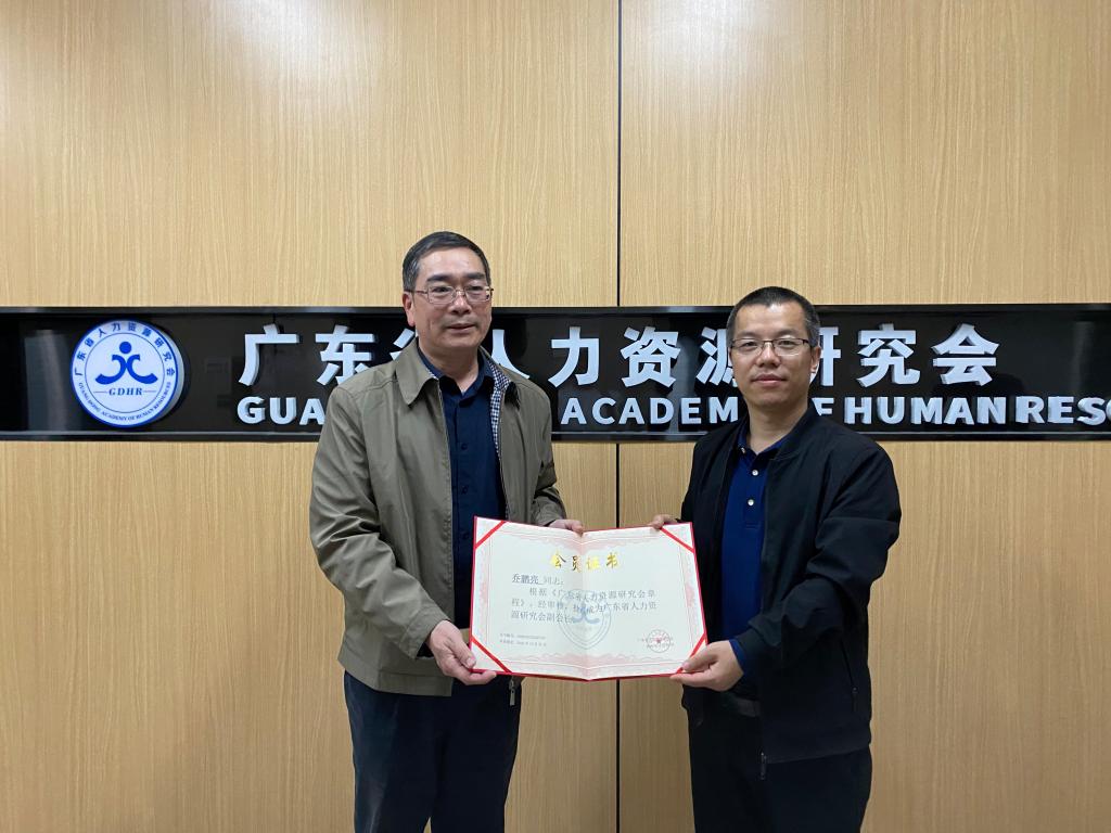 访企拓岗交流活动后,广东省人力资源研究会执行会长谌新民教授为管理学院乔鹏亮院长颁发副会长聘书。