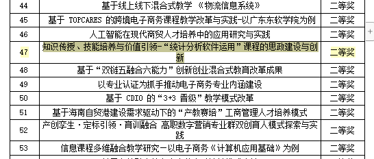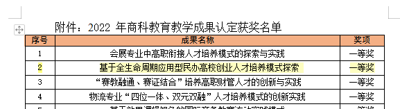 【本网讯】 近日,中国国际贸易促进委员会商业行业委员会、中国国际商会商业行业商会发布了《关于公布2022 年商科教育教学成果认定获奖名单的通知》,我院《基于全生命周期应用型民办高校创业人才培养模式探索》荣获一等奖;《知识传授、技能培养与价值引领-“统计分析软件运用”课程的思政建设与创新》荣获二等奖。