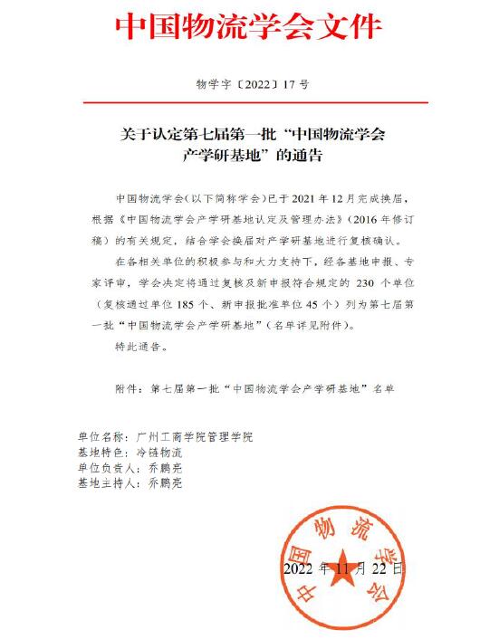 【本网讯】根据《中国物流学会产学研基地认定及管理办法》(2016年修订稿)的有关规定,经中国物流学会组织专家多轮评选,我院成功入选“第七届第一批中国物流学会产学研基地”建设名单,基地主持人为管理学院院长乔鹏亮教授,基地特色为“冷链物流”。