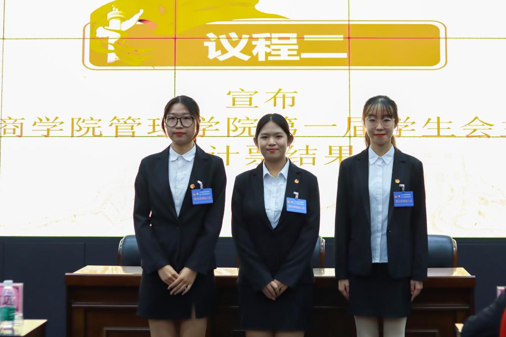 最终结果:冯西亚、林宝明、曹俊一、黄炜均、廖永祺、万振林担任管理学院第一次学生代表大会常任代表,梁田、周楚锨、容瑜蔚担任管理学院学生会第一届主席团成员。