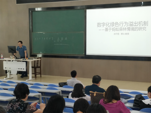 佘教授从“数字化绿色行为溢出机制研究”的研究背景、研究设计、主要研究内容、研究过程和结论等五个方面向老师们毫无保留的分享了自己的研究成果。创新的选题方向、方法和技巧,逻辑严谨的研究设计和研究过程,拓展了现场老师们的学术视野、科研创新意识,激发了老师们的科研创新潜力。