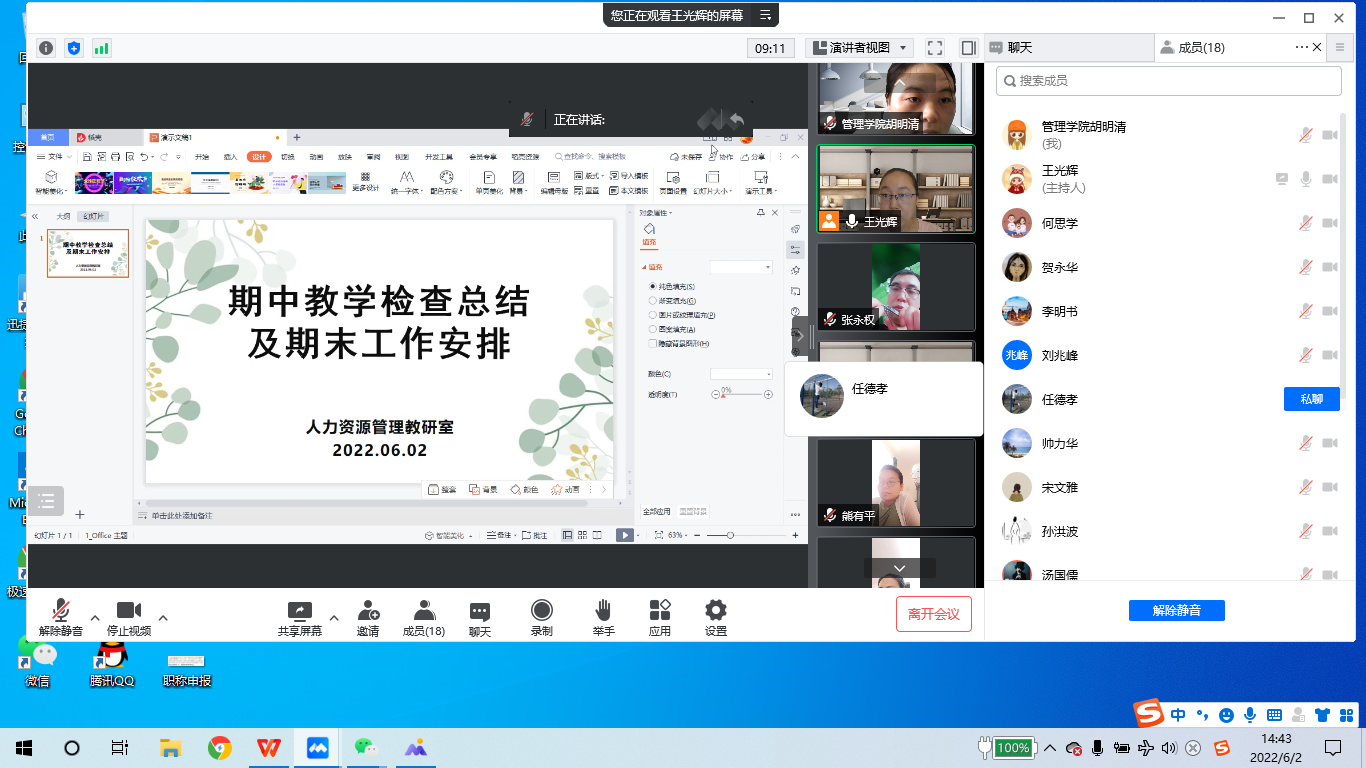 【本网讯】2022年6月2日下午14:30-16:00,人力资源管理教研室利用腾讯会议召开了期中教学检查总结及期末工作安排会议,王光辉主任主持,人力资源管理教研室19位教师参加会议。