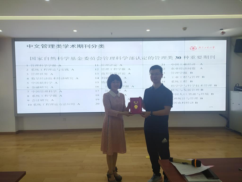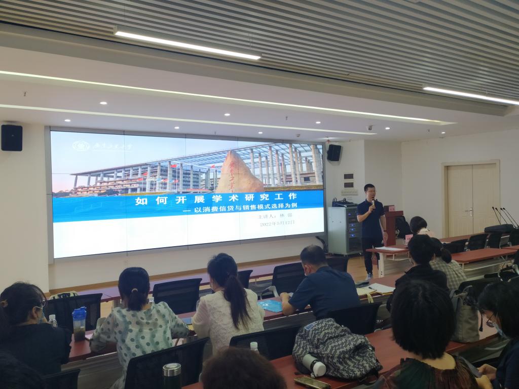 本次活动邀请广东工业大学特聘副教授、硕士生导师林强博士主讲,林博士结合自己丰富的科研经历,从研究选题、研究内容、未来研究方向三大方面,以消费信贷与销售模式选择为切入点,详细介绍了如何开展学术研究工作。林博士认为,一个好的选题有五个判断标准:是否我认为重要、是否有能力贡献、是否别人也认为重要、是否增值、是否能预期结果。在研究内容方面,林博士重点对“不同消费支付方式下电商供应链销售模式选择”、“平台企业的消费信贷服务提供策略:免费或收费”、“电商平台的消费信贷与销售模式联合决策”三项研究内容进行了详细介绍。