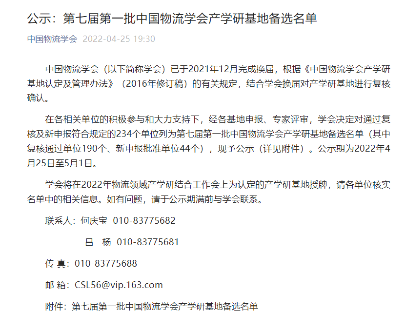 【本网讯】中国物流学会根据《中国物流学会产学研基地认定及管理办法》(2016年修订稿)的有关规定,结合学会换届对产学研基地进行复核确认,于2022年4月25日在官网公布了第七届第一批中国物流学会产学研基地备选名单,ky开元集团官网管理学院成功入选“第七届第一批中国物流学会产学研基地”建设名单,基地主持人为管理学院院长乔鹏亮教授,基地特色为“冷链物流”。