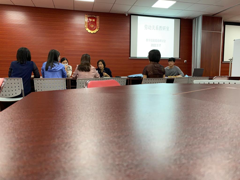 【本网讯】2022年3月17日下午,劳动关系教研室在第二实验楼A-205劳动法律诊所实训室召开教学技能提高研讨会,会议由钟琦主任主持,全体教研室教师参加了本次会议。