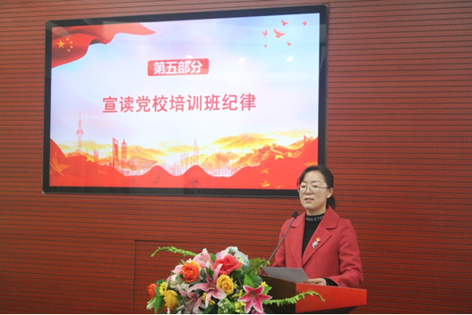 随后,姜云霞教授在大会中宣读了党校培训班纪律。她讲述了六大点:第一点要坚持党的领导,政治上行动上必须同党中央保持高度一致;第二点坚持从严管理的学员管理制度,加强学员品德修养的重要意识;第三点请假需按程序履行请假手续,严禁迟到早退;第四点严格遵守纪律,上课时手机关机或置于无声状态,严禁接打电话;第五点讲师的讲课资料课件仅限培训期间学习交流使用,未征得许可不得录音录像;第六点未取得网络学习平台学习证明,一律取消结业考试的资格参加,考试不及格者一律不予结业。