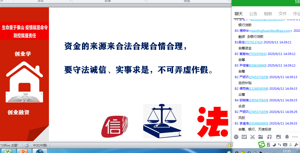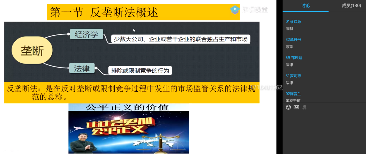 第二场公开课由刘雪萍老师讲授,在刘老师的《经济法》公开课中,她以竞争法为例,利用翻转课堂模式下的腾讯课堂讲授+学习通的多平台混合式教学方法,将华为公司的创新精神与国产替代、党与政府的知识产权保护政策、国人当自强、社会主义核心价值观等课程思政元素巧妙地融入专业知识点当中,还将网络热点事件如“美国高通公司为什么被中国政府处罚”事件做为互动议题,激发了学生的学习兴趣,将课程内容与思政教育实现了无缝对接。