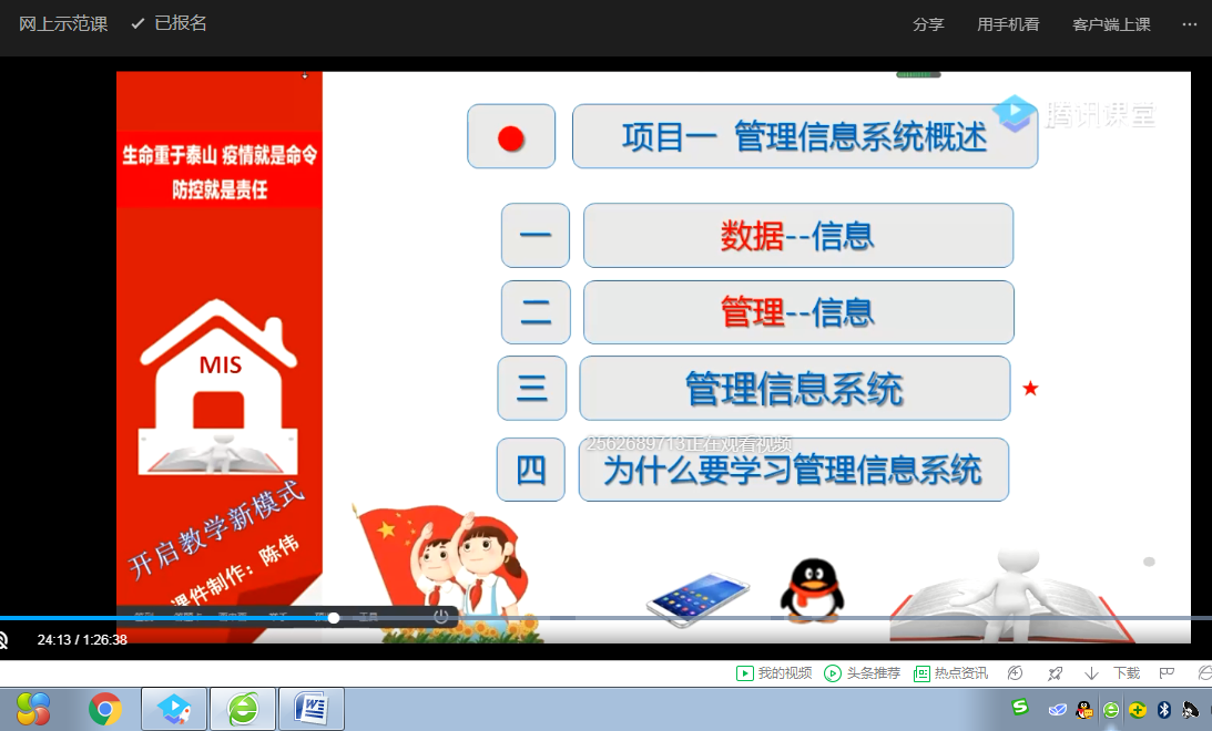陈伟老师结合个人多年企业与学校教学经验,运用QQ分享屏幕功能和腾讯课堂客户端软件,仔细地给各位老师分享了如何利用现代网络工具进行网上教学课堂活动,从软件的下载安装、功能使用、课堂教学活动的开展和应用技巧等方面进行示范和讲解。通过软件远程示范了《管理信息系统》课程中的《数据与信息》章节知识点,网上课堂从观看新冠肺炎专题教育视频进入课程,课程巧妙融入思政元素,提出问题到分析问题再到解决问题,展现出本节的知识点数据与信息概念的区别与联系,信息与知识、知识与智慧的内在关联,激发掌握信息、学习知识、启迪智慧、增长才干的兴趣与动力。同时,在课程中示范了设置讨论互动知识点及问题等活动。