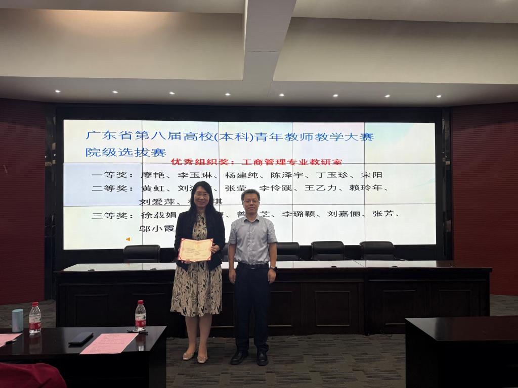 随后,大会进入表彰颁奖环节。首先颁发的是广东省第八届高校(本科)青年教师教学大赛院级选拔赛奖项。工商管理专业教研室凭借出色的组织能力,荣获优秀组织奖。一等奖获得者廖艳、李玉琳、杨建纯、陈泽宇、丁玉珍、宋阳老师,二等奖获得者黄虹、刘鸿宇、张莹等老师,以及三等奖获得者徐载娟、谢康康、曾灵芝等老师依次上台领奖。这些获奖教师在教学比赛中展现了扎实的专业知识和精湛的教学技巧,为学院赢得了荣誉。