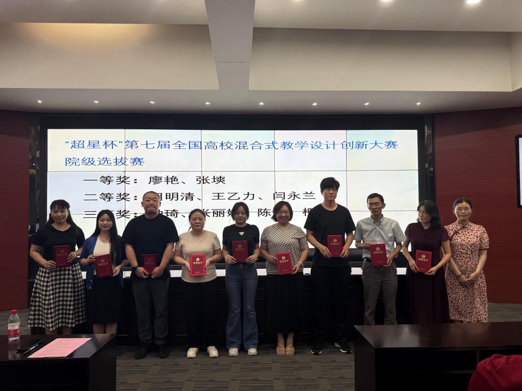 接着,“超星杯”第七届全国高校混合式教学设计创新大赛院级选拔赛的获奖教师也受到了表彰。一等奖获得者廖艳、张塽老师,二等奖获得者胡明清、王乙力、闫永兰老师,以及三等奖获得者钟琦、张丽娜、陈伟、柳颖老师依次上台领奖。他们的教学设计创新性强,将传统教学与现代信息技术相结合,为学生提供了更加丰富多样的学习体验。