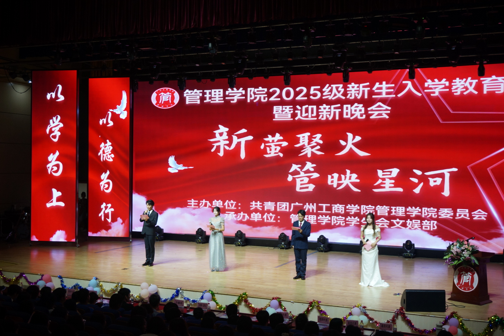 【本网讯】2025年9月28日晚,管理学院在三水校区千人影视厅隆重举行了2025级新生入学教育暨“新萤聚火,管映星河”迎新晚会。管理学院乔鹏亮院长、学校学生工作部徐达部长、管理学院赵小锋副院长、梁春树副院长,以及学院教师代表与全体2025级新生齐聚一堂,共同见证了这场开启大学新篇章的盛会。