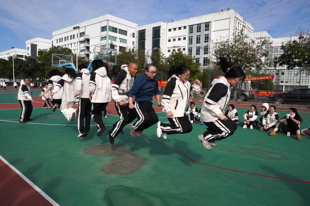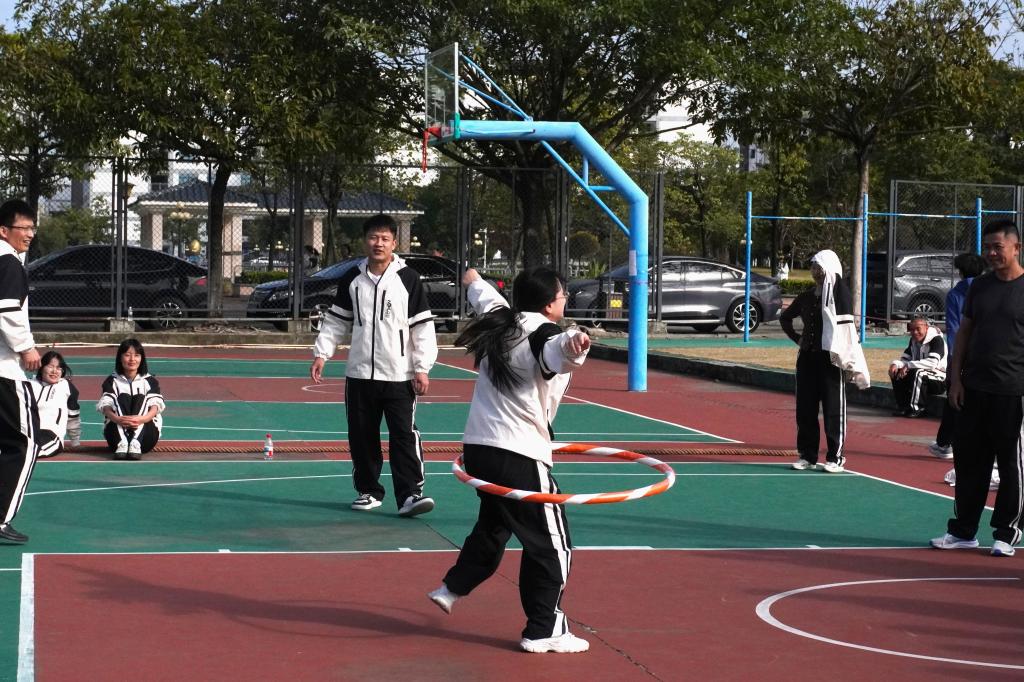 篮球场上的跳长绳项目,绳影翻飞间,大家身姿矫健、连贯跳跃,凝聚着每一个人的努力。摇绳的老师腕部轻抖,绳圈在半空划出匀速弧线,跳绳的队伍踩着绳击声鱼贯而入,身后成员紧随其步,有人脚尖点地轻弹,有人屈膝收腿规避。当中途脚绊绳圈时,队员立刻调整队列,下一秒便在绳影里连成不停歇的阵形。在一分半钟的高频节奏里,练的是成员间的反应衔接,让团队之间的联系更紧密。