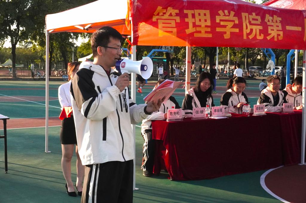 首先,由管理学院党委书记、院长乔鹏亮致开幕词,既表达了对运动会顺利举办的期待,也强调了运动健身与团队协作的重要意义。乔鹏亮院长在讲话中强调,体育锻炼不仅能强健体魄,更能缓解工作压力、改善心理状态。此次活动既是健身赛场,更是交流平台,鼓励老师们在运动中发现同事的闪光点,取长补短、增进情谊。