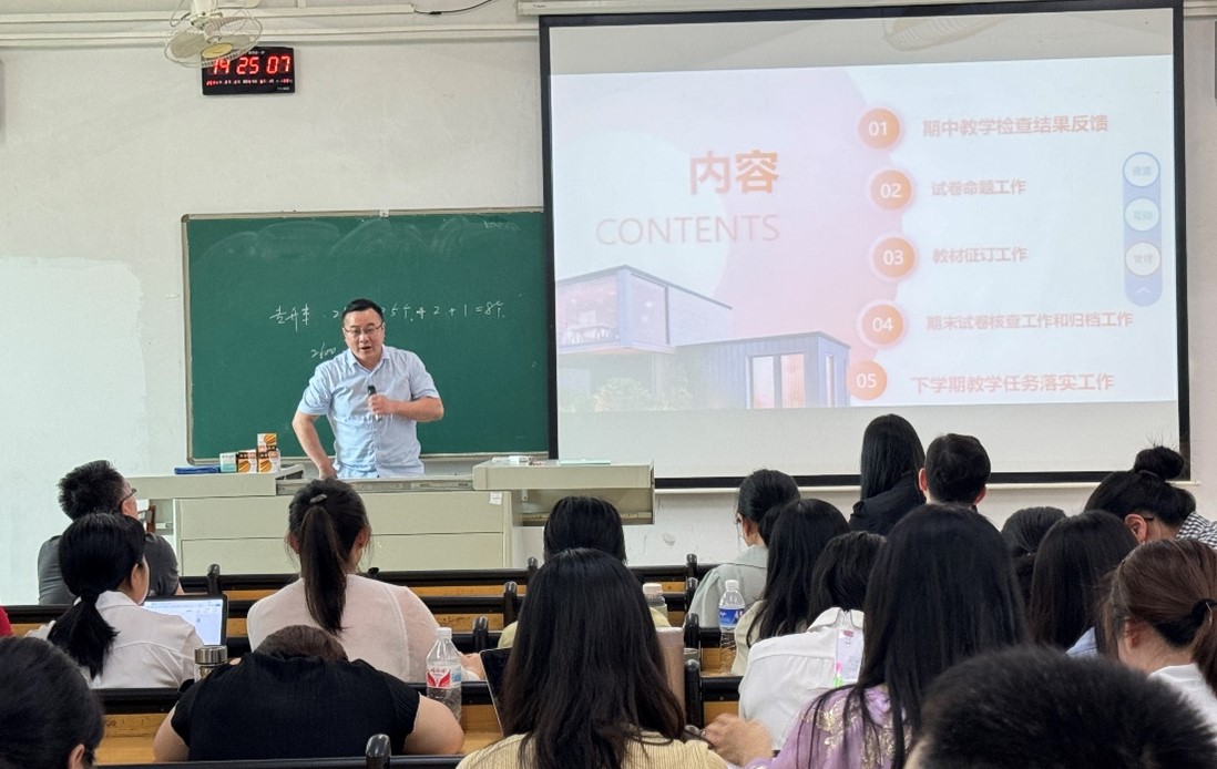 随后,韩剑义主任发表了讲话。他对期中教学检查任务进行了反馈,指出学生对教师整体评价较高,但到座率有所下降。他建议教师们加强学习,提高教学质量。同时,他还提到了命题试卷审查问题、课程代码统一、命题类型规范以及命题保密等问题,为教研室今后的工作提供了宝贵的指导意见。
