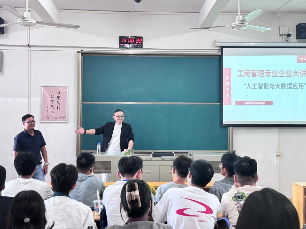 【本网讯】2024年10月29日,管理学院工商管理专业教研室邀请了广州市视云信息科技有限公司的黄洪胜总经理,面向23工商管理企业数智管理B1班,开办了工商管理专业企业大讲堂,主题为《人工智能与大数据应用》。