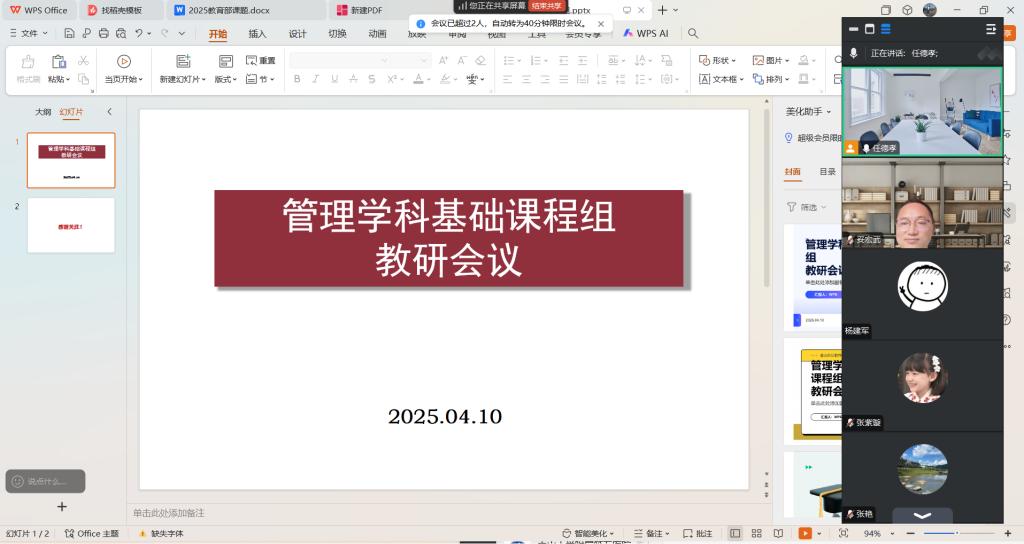 【本网讯】2025年4月10日下午,人力资源管理教研室各B类教研室成功召开了以“基层教学组织建设”为主题的研讨会,各B类教研室安排教学常规事务,引领会议聚焦教师合作交流,助力基层教学组织建设。