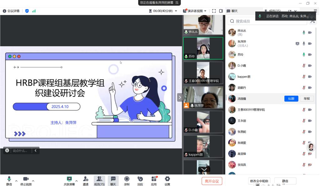 HRBP通识课程组会议由课程组负责人朱萍萍老师主持,会议重点围绕“近期重点工作事项”展开,重点讨论了以下四个方面:1.强化意识形态教育,课堂引用国内优秀企业案例。2.加强课堂教学管理。3.关注论文进度。4.期中教学材料检查与教学比赛安排。会议还针对期中教学检查工作进行了部署,要求教师按时提交相关资料,确保教学检查工作的顺利开展。朱老师鼓励大家积极报名参加即将开展的第七届全国高校混合式教学设计创新大赛,并做了具体安排。