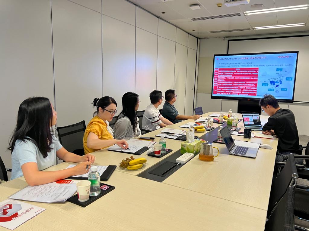 在翰智集团校企合作负责人张树烨经理的陪同下,教师们首先参观了集团总部的智慧办公区,然后在数字化体验空间了解了翰智的数字化业务单元和翰智数科教育云,张经理同步介绍了翰智的实践教学智慧平台、数字教学资源开发、校企合作教材开发、师资培训、技能竞赛等服务。