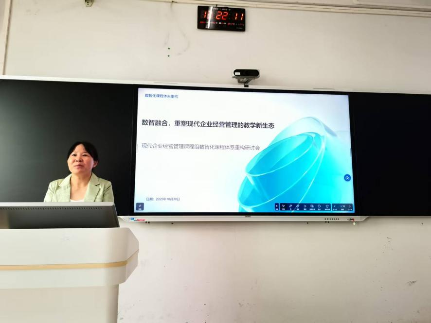 【本网讯】为进一步规范课程考核流程,提升教学质量,2025年10月30日,现代企业经营管理课程教研室在教学楼Ⅰ-C506教室召开了以“重构数智化课程体系”为主题的教研室会议。会议由组长代春花老师主持,全体教研室任课教师参加。