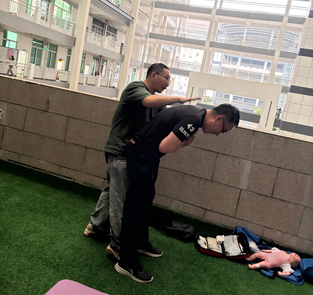 理论讲解结束后,实操实践环节在教室外有序开展。现场配备专业急救模拟道具,王保生老师进行一对一、手把手指导,针对按压姿势、深度、频率,以及AED电极片粘贴、操作流程等实操细节逐一纠正,确保每位老师都能规范完成全套急救操作。参与培训的老师们积极动手、认真练习,在实操中巩固理论知识,熟悉急救步骤,切实提升了应急救护的实操能力和自信心。