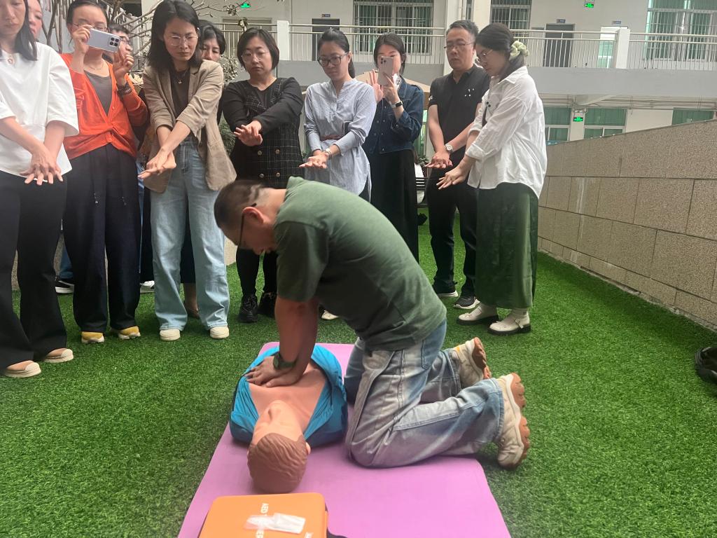 针对AED设备的实操使用,王保生老师逐一讲解电极片标准粘贴位置、设备开机后的语音提示操作流程,重点强调心律分析和放电阶段严禁接触患者的安全准则。同时,针对孕妇、胸部有毛发、汗水、佩戴心脏起搏器、身体潮湿等特殊人群与禁忌场景,详细说明对应的处理方法,让老师们掌握不同情况下的设备使用技巧。此外,老师结合溺水这一常见应急场景,讲解“施救者安全第一”的救援原则,教授简易漂浮物制作、长杆拖拽等间接救援方法,以及溺水者上岸后呼吸道清理、倒立、俯卧位控水的标准操作,全方位覆盖日常高频应急救援场景。