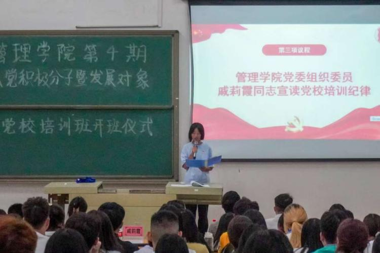 接着,由管理学院党委组织委员戚莉霞同志向学员们宣读党校培训纪律,要求培训班学员必须遵守法律法规,严守政治纪律,自觉加强党性修养,明确自身学习任务,认真学习党的基本理论知识,用理论知识武装大脑,同时要正确看待得与失,更加向党组织靠拢。
