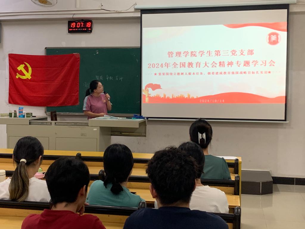 管理学院学生第五党支部于10月14日下午于第一教学楼D204教室开展党的二十届三中全会精神主题学习活动,书记胡国悦同志带领支部党员深入学习领会习近平总书记重要讲话和《中共中央关于进一步全面深化改革、推进中国式现代化的决定》精神,深刻领悟党中央关于进一步全面深化改革的战略考量,深入解读全会的总体目标、重大举措和深远意义,教育引导学生党员提高政治意识,强化责任担当。
