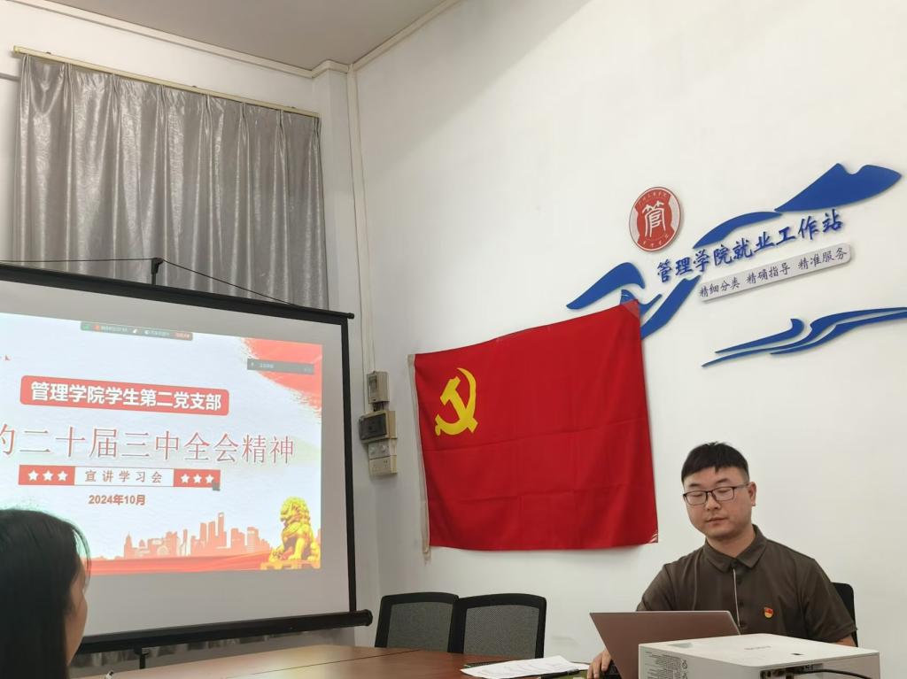 管理学院学生第二党支部于10月14日在第一教学楼B202教室开展了关于党的二十届三中全会精神宣讲学习会。组织委员程权同志对过去改革举措的完善和提升的细化讲解,针对“着力解决干部乱作为、不作为等问题”以及“我国建成世界上规模最大的教育体系”这两个版块进行了更进一步的拓展,组织党员深刻领会党中央对进一步全面深化改革,推进中国式现代化作出的战略部署。