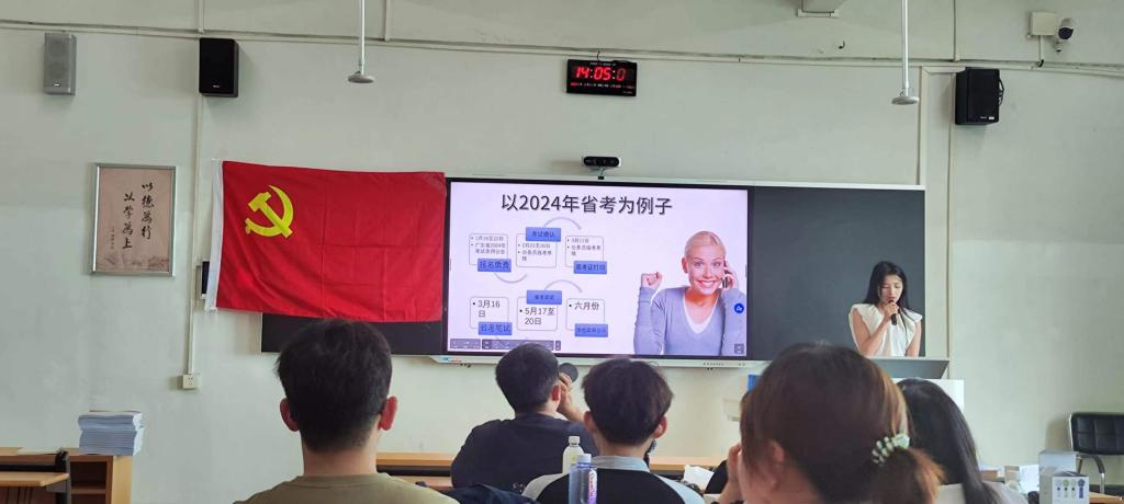 随后,支部的毕业生党员黄凯鑫同学他首先回顾了自己的考公历程,提到在备考过程中,除了扎实掌握知识,还需具备良好的心态和策略,他分享了自己如何有效获取考试信息、选择适合自己的岗位等实用技巧,为同学们提供了宝贵的参考。同时,他还向同学们分享了一个重要的经验,强调要认真思考自己未来的目标及就业方向,把握住每一个机会,多参加各类活动以锻炼自己,从而弥补简历上的不足。他提到,许多用人单位在招聘时不仅看重学历和成绩,更看重应聘者的综合素质和实践经验。因此,他鼓励学弟学妹们要积极参加各种比赛、实习、志愿服务等活动,通过实践来提升自己的能力和素质。