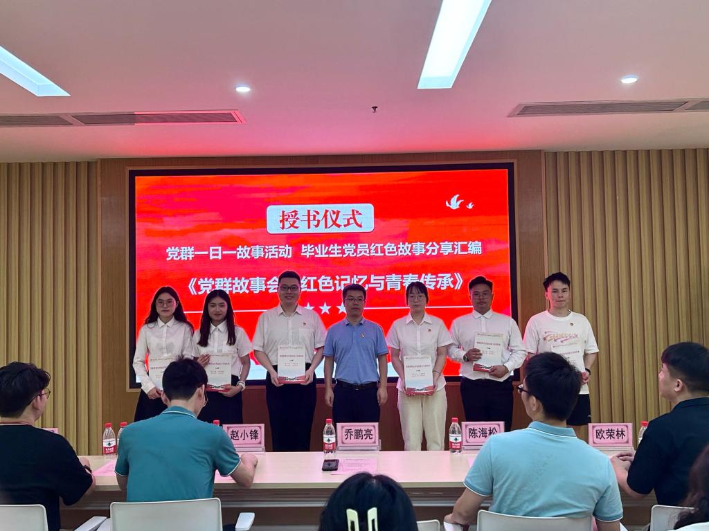接下来是授书仪式,党委书记乔鹏亮同志为毕业生党员代表发放党群一日一故事分享活动的汇编纪念册——《党群故事会:红色记忆与青春传承》,该纪念册由管理学院2020级至2023级全体学生党员共同完成,记录了他们所分享的许多感人至深和意义非凡的红色故事,以及分享者本人的感想,希望全体毕业生党员坚定理想信念,不忘入党初心,传承红色文化。