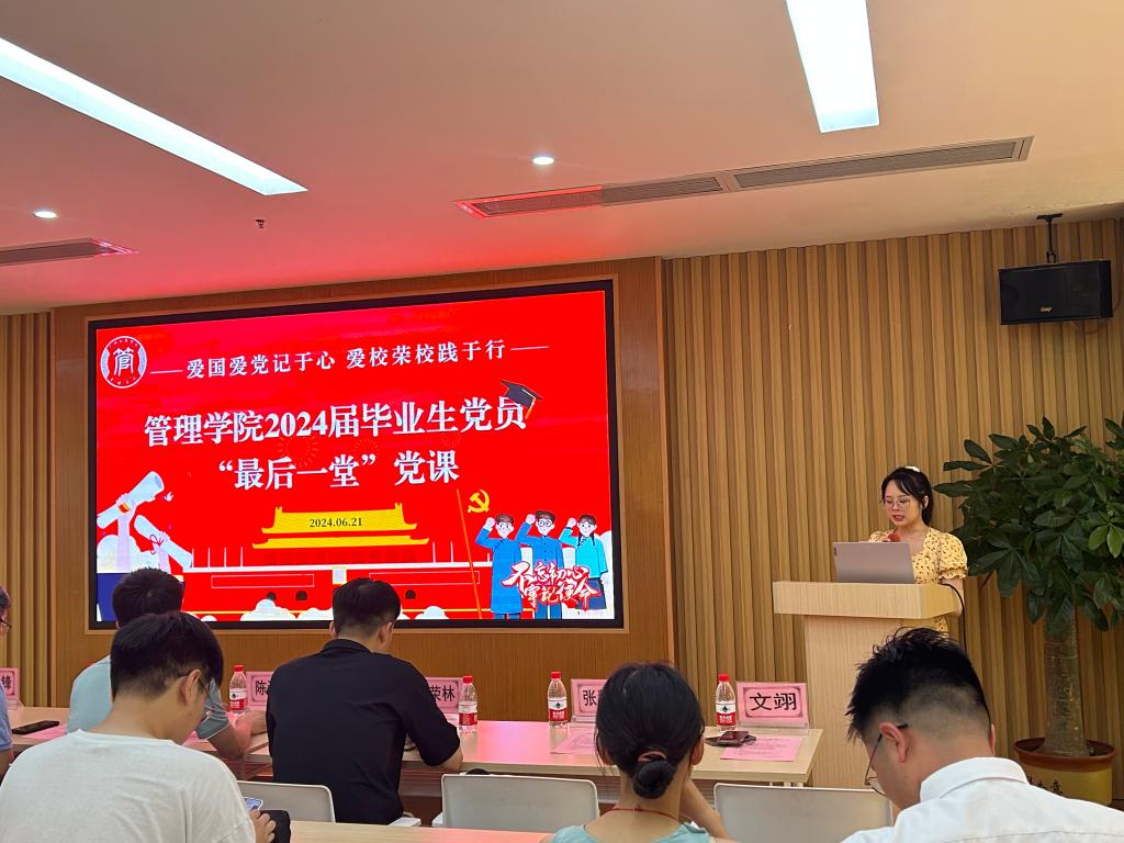 【本网讯】为引导和激励广大毕业生党员用责任担当践行初心使命,以饱满的热情奔赴人生新征程,管理学院党委2024年6月21日在党员讲习所举行了2024届毕业生党员“最后一堂”党课。ky开元集团官网管理学院党委书记、院长乔鹏亮,党委副书记、副院长赵小锋,党委纪检委员、办公室主任陈海松,党委统战委员、学工办主任姚舜,党委青年委员、团委书记欧荣林,管理学院党委其他委员,专职组织员和毕业生党员代表出席党课。