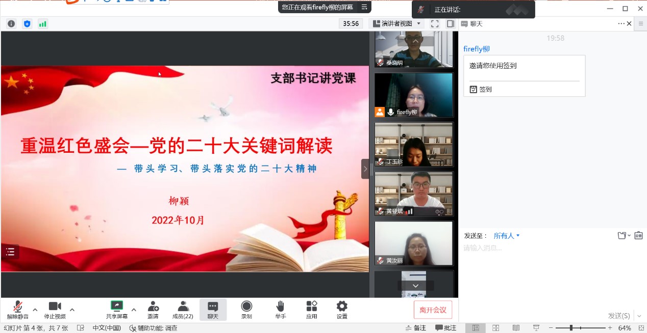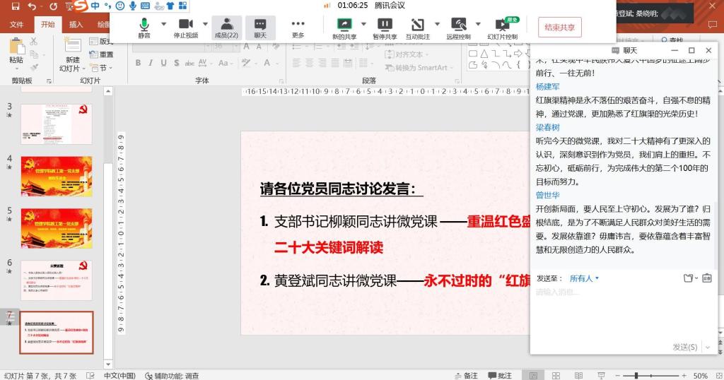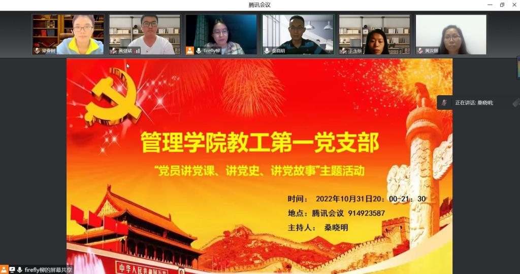 2022年10月,管理学院教工第一党支部在线上召开支部党员大会、组织生活会,会议由桑晓明同志主持,支部书记柳颖同志以“重温红色盛会-党的二十大精神解读”为主题给支部全体党员上了一堂生动、深刻的党课。会上,支部组织委员黄登斌同志以“永不过时的红旗渠精神”为主题进行演讲、分享,与会党员在里聊天框纷纷展示自身的心得感悟。历史是最好的教科书,通过党课学习,重温了党的艰苦奋斗的革命历程,党员们深刻体会了党肩负的历史使命,加深了作为党员的身份意识和责任感。